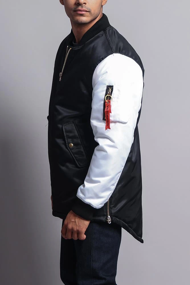 The MA-1 style flight/bomber jacket is a classic style that should be had in every man’s closet. Step your game up with this version that features an extended length and contrast sleeves.