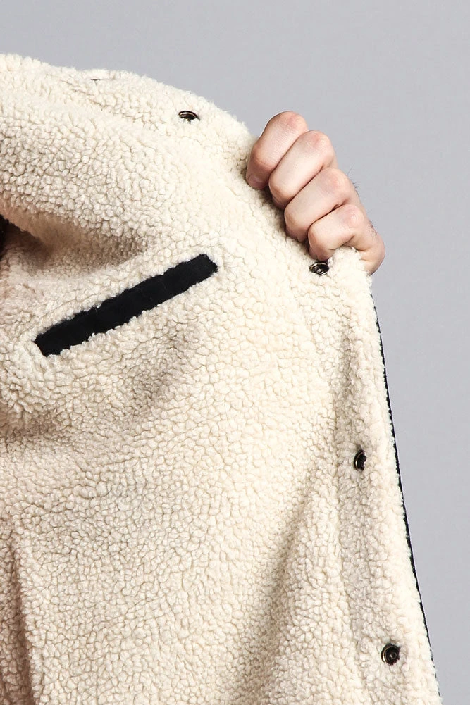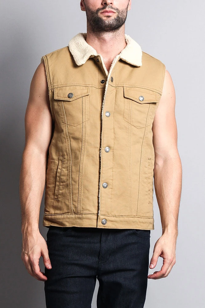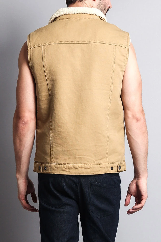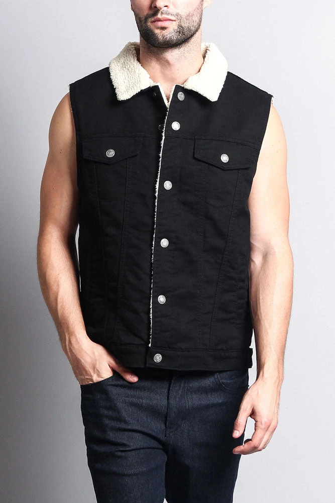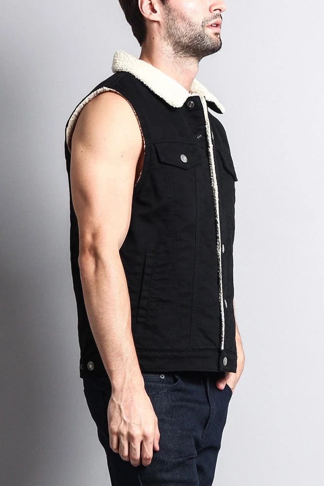 A vest featuring super-soft faux shearling lining, a button front closure, a basic collar, two front flap buttoned pockets, and an inner jacket pocket.