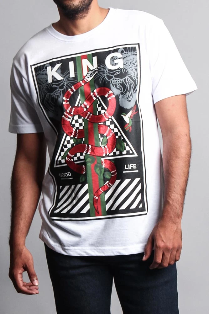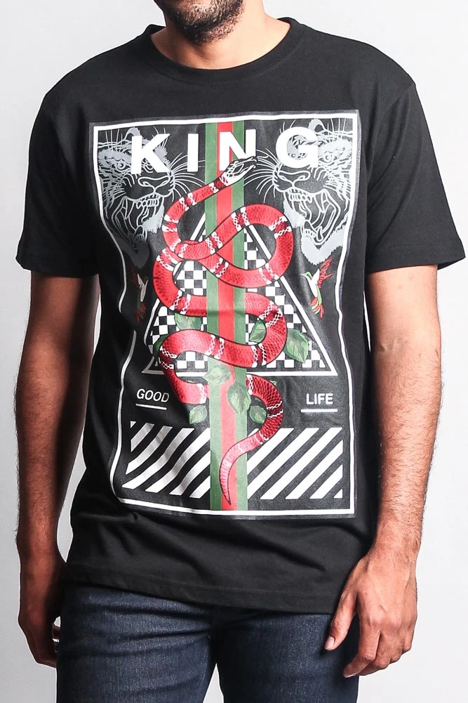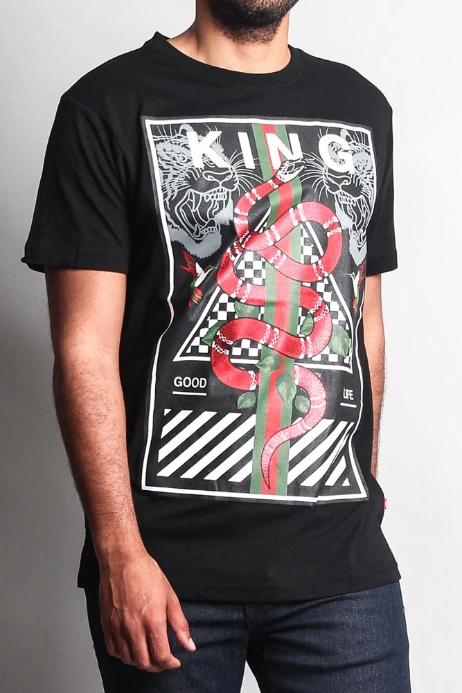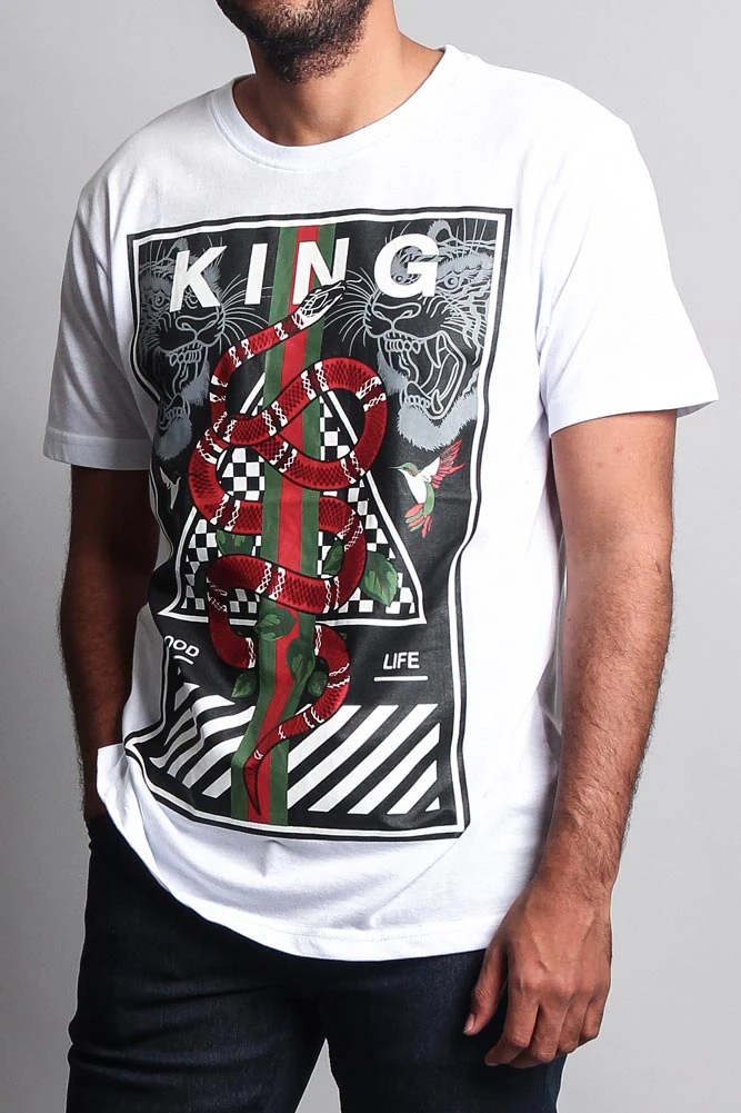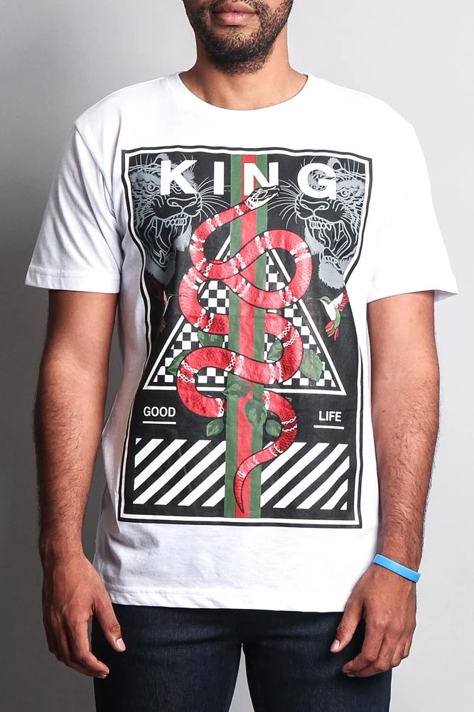 Stick with the trends in our high fashion inspired t shirt. Features green/red stripes, checkerboard, a bold snake design and so much more.