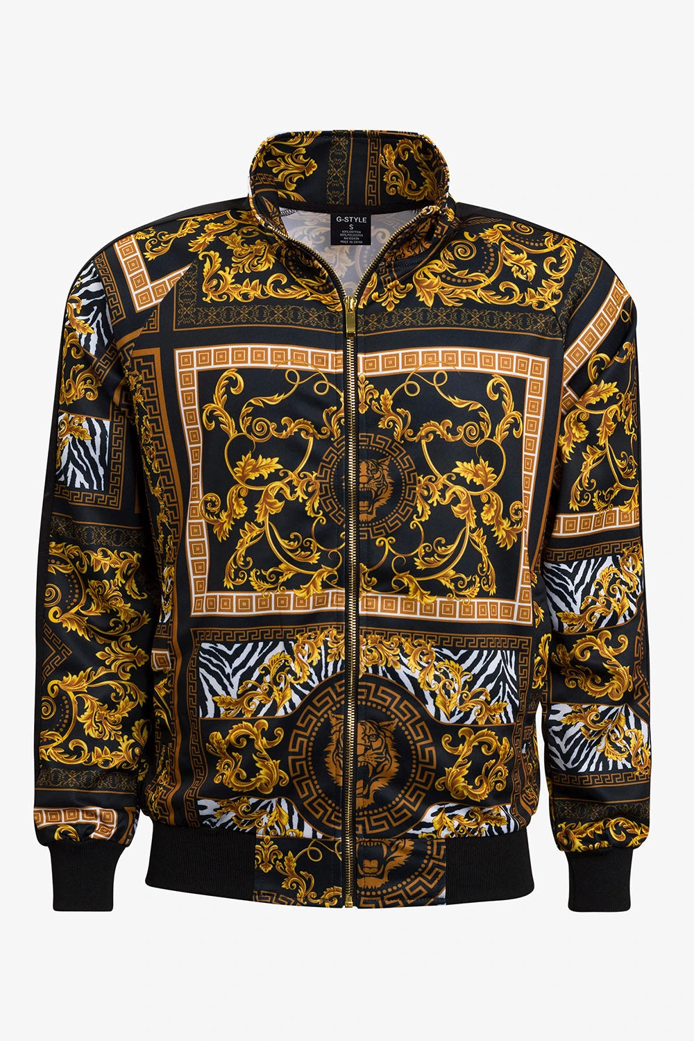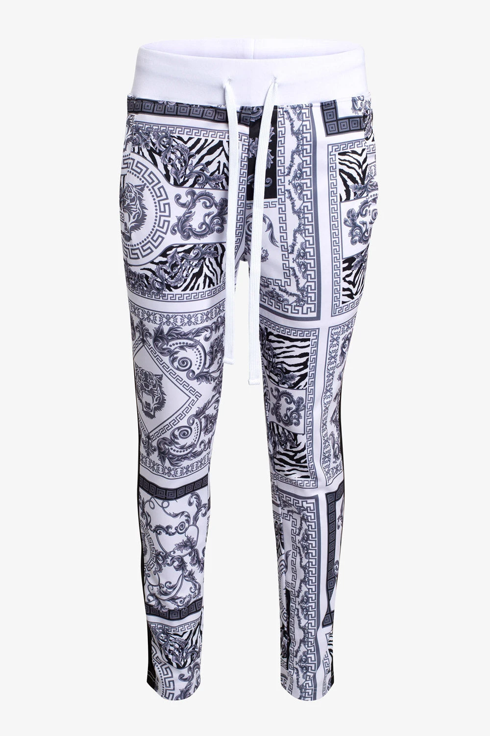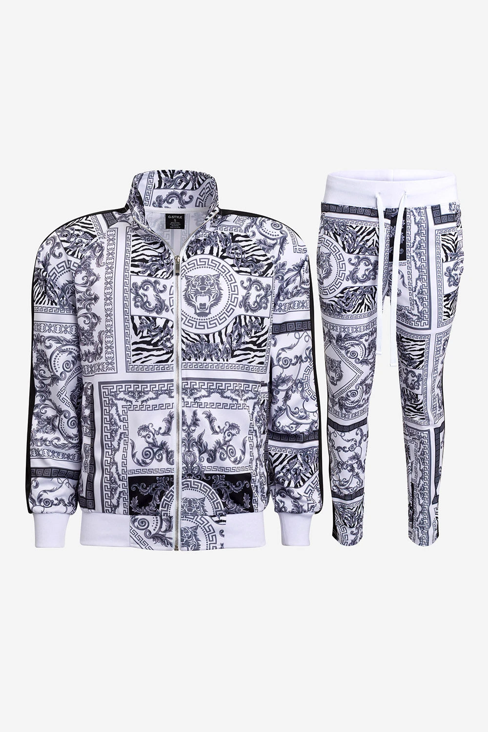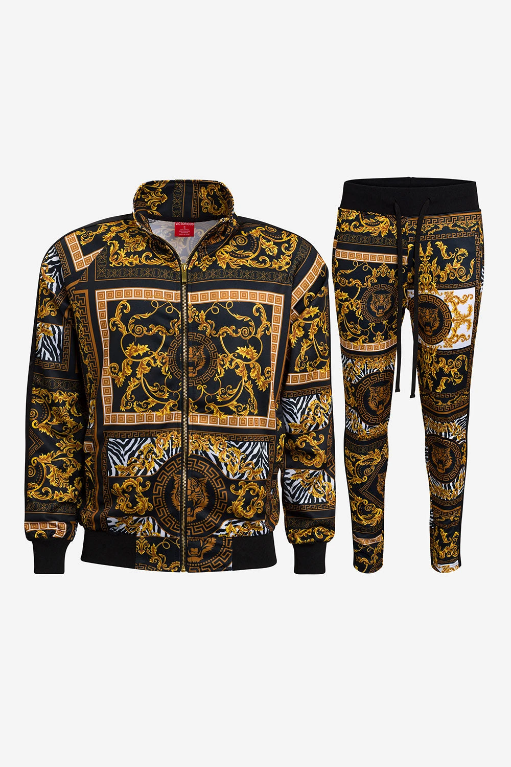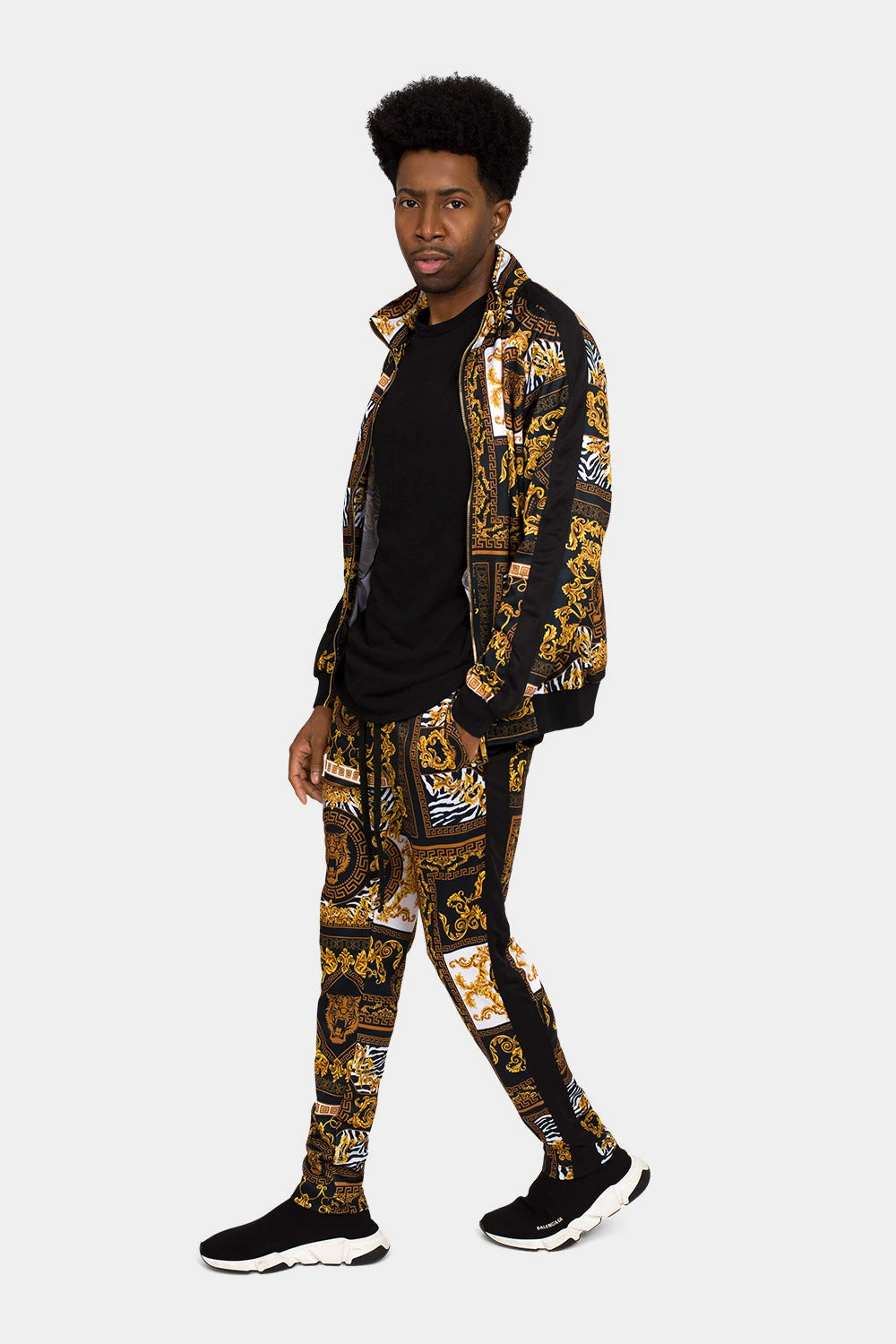 Follow the latest trends inspired by your favorite hip hop artists. Feel comfortable and look fly in our luxury print track suit featuring, black strips going down your legs and arms, an adjustable waistline, and a zipper by the ankle for a custom fit.