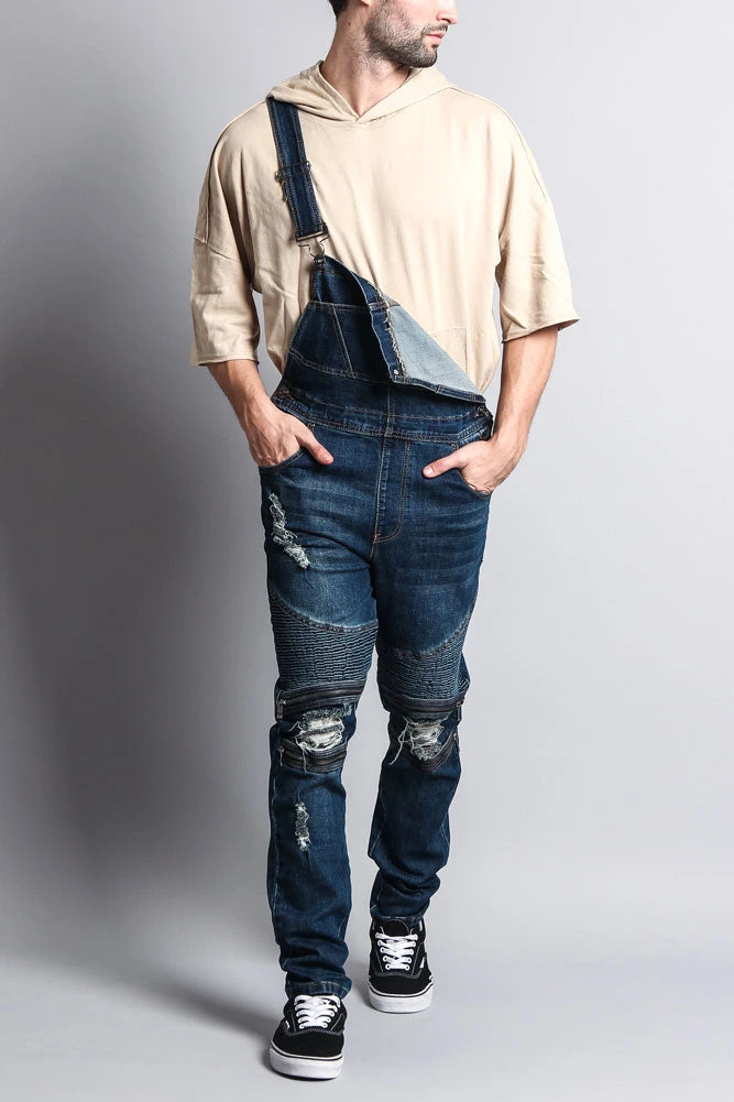 A pair of denim overalls featuring moto ribbed paneling on the front, adjustable straps, button sides, and torn knees with zipper detailing.