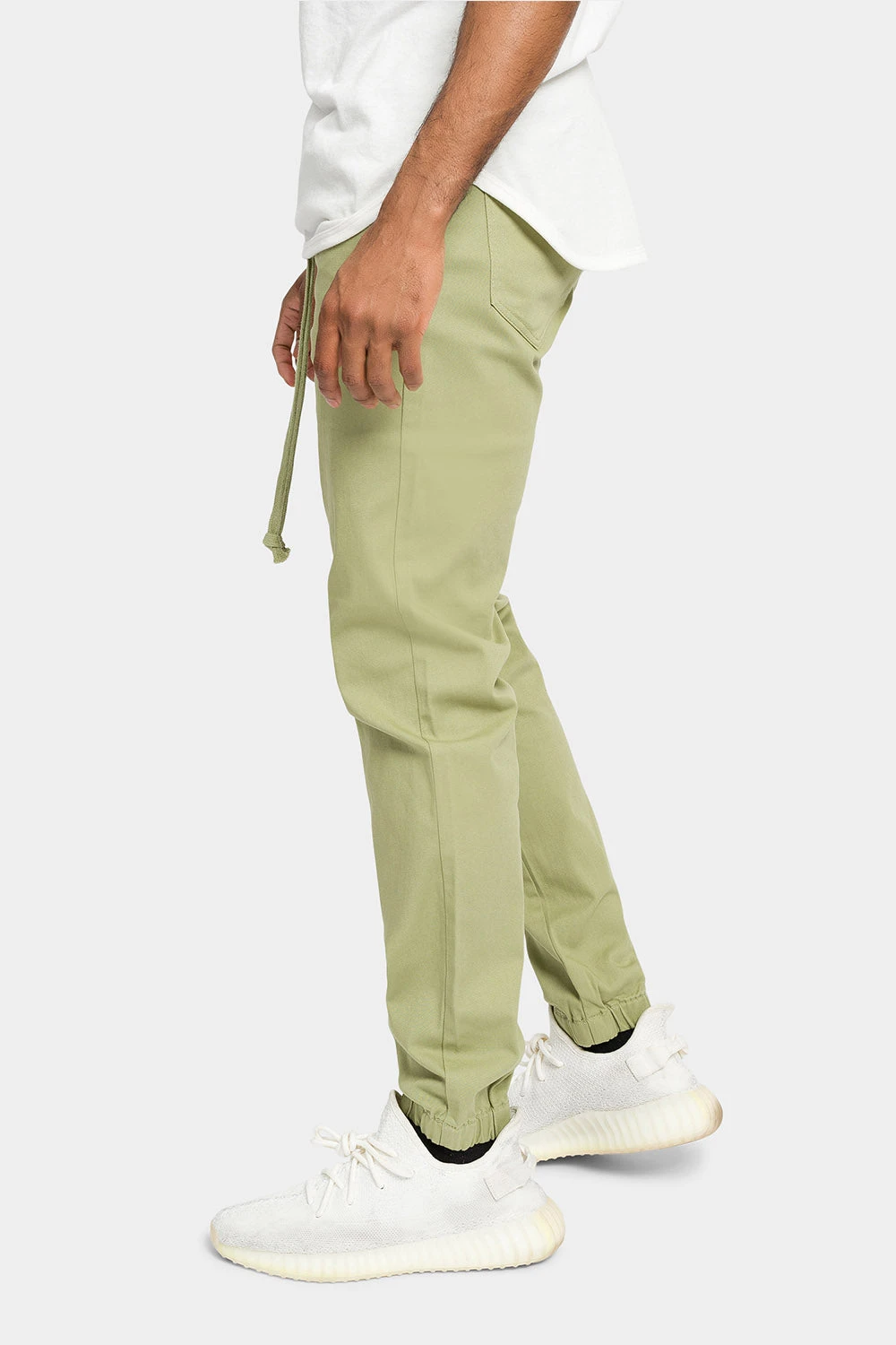 - Drop-crotch, loose through thigh, extreme tapered leg, elastic drawstring waist, elastic cuffs
