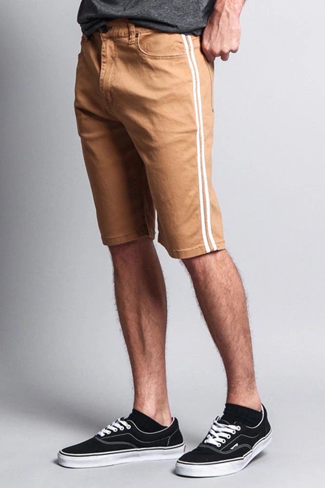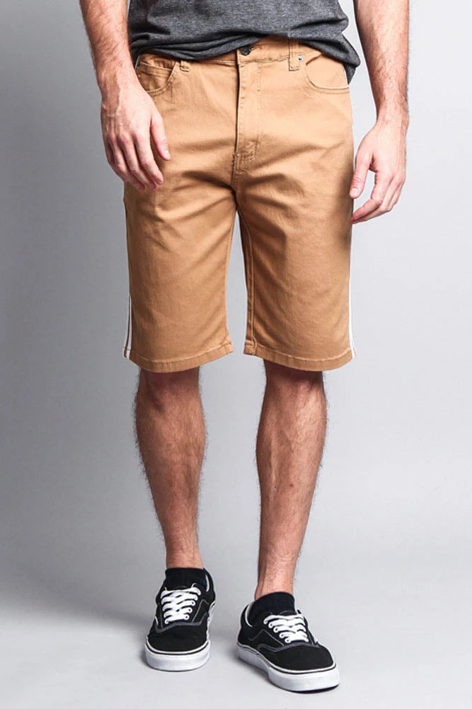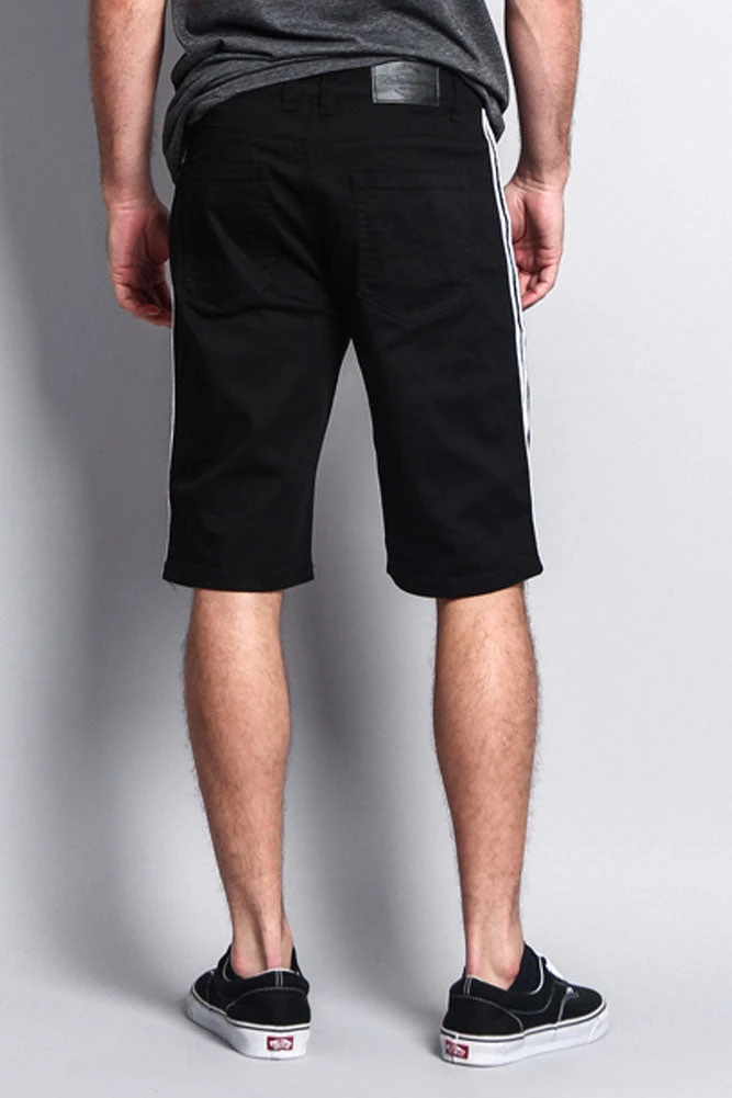 Stay cool and stay in style with our trendy new jean shorts featuring two contrasting stripes down the sides.