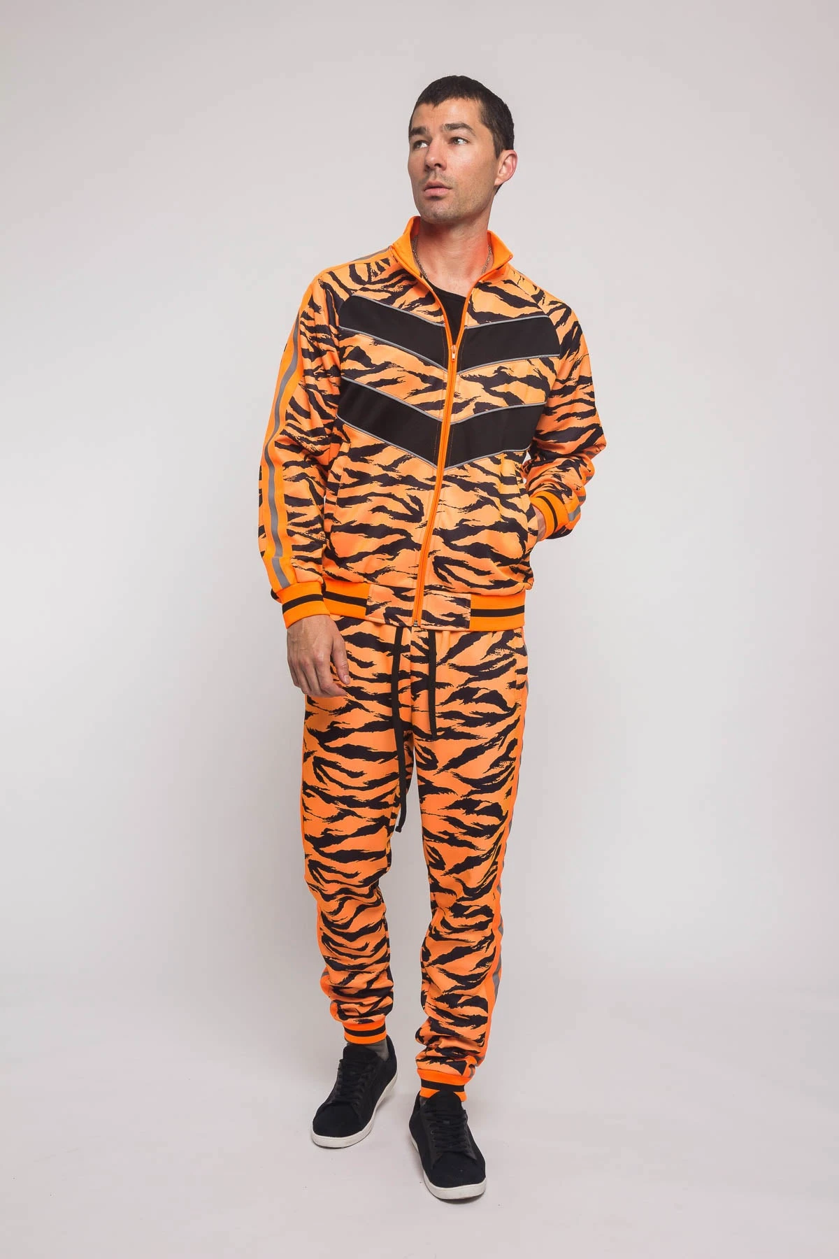 Inspired by the latest high fashion trends, look super chic and sporty without the effort. Made with quality and comfort in mind for that perfect fit. This sporty tracksuit features trendy reflective tape across the chest. Perfect for any casual occasion or a busy active day. The perfect go to look!